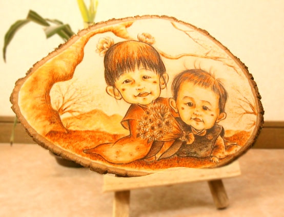 自然の木のぬくもりとの調和、焼き付けたような色合いで浮かび上がるように描かれます。
